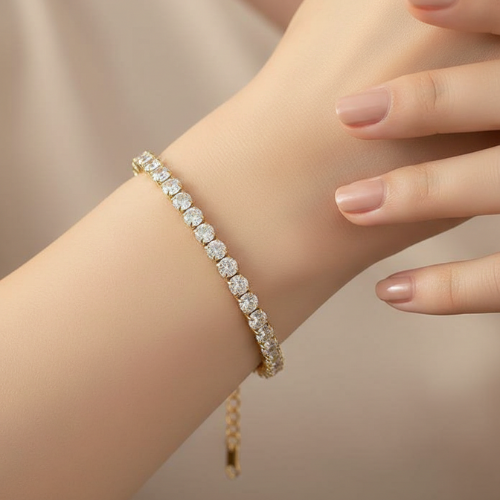 This party wear bracelet features high-shine crystal stones set in a classic tennis design, offering brilliance from every angle. The secure clasp ensures a comfortable and confident fit, making it perfect for parties, weddings, festive occasions, and evening events. Pair it with gowns, sarees, or cocktail outfits for a sophisticated and dazzling look.Shop now to explore more stylish bracelet in our collection.