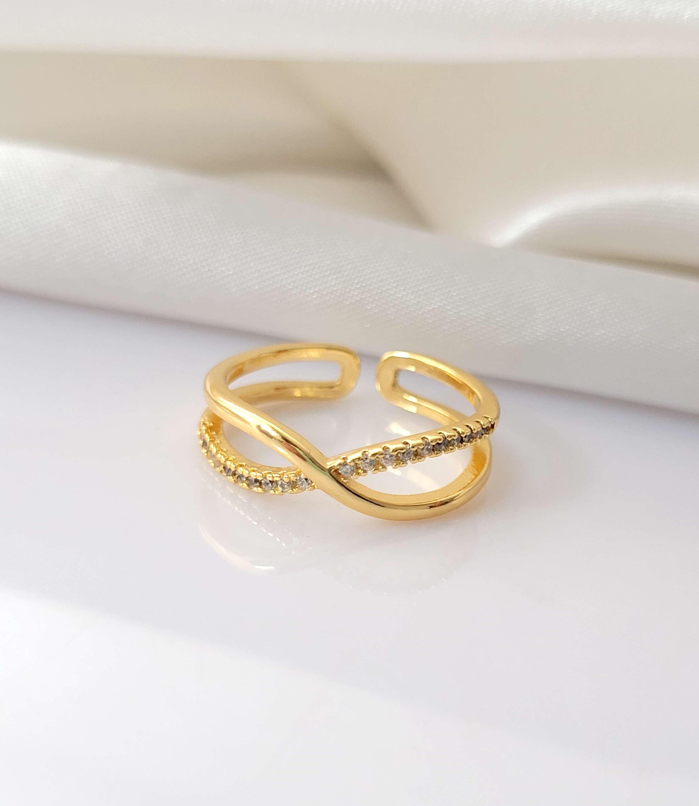 A stylish golden infinity twist ring with delicate sparkle, perfect for everyday casual wear. Lightweight, adjustable, and effortlessly elegant.