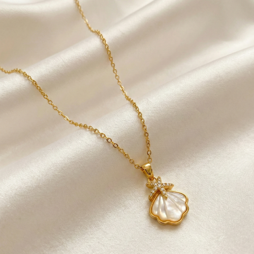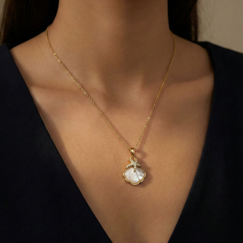 A floral-inspired pearl shell bow necklace with crystal detailing, perfect for elegant everyday and special occasion wear.
